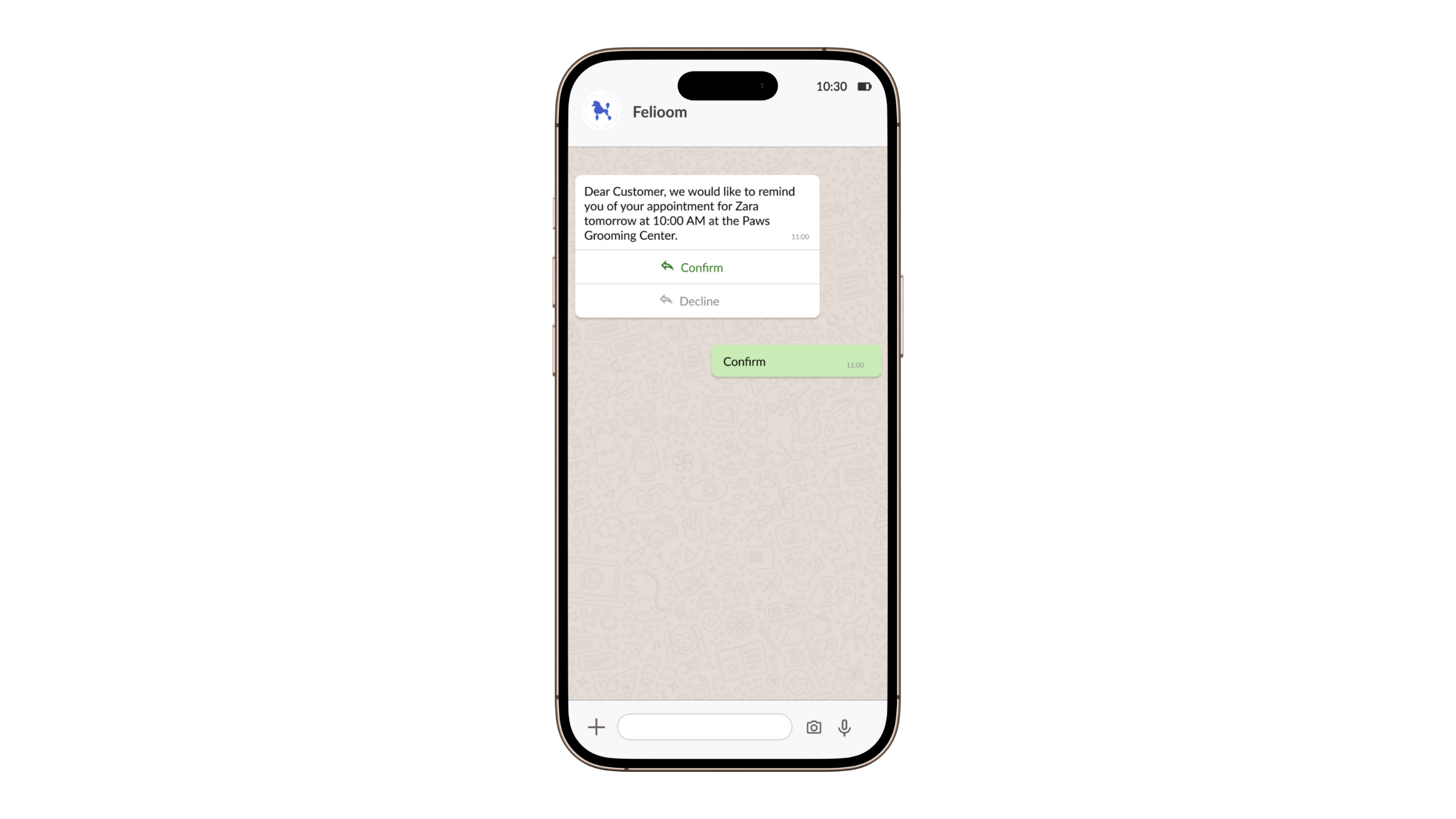 Reduce no-shows: Felioom automatically sends personalized WhatsApp confirmations and reminders to clients before their appointment.