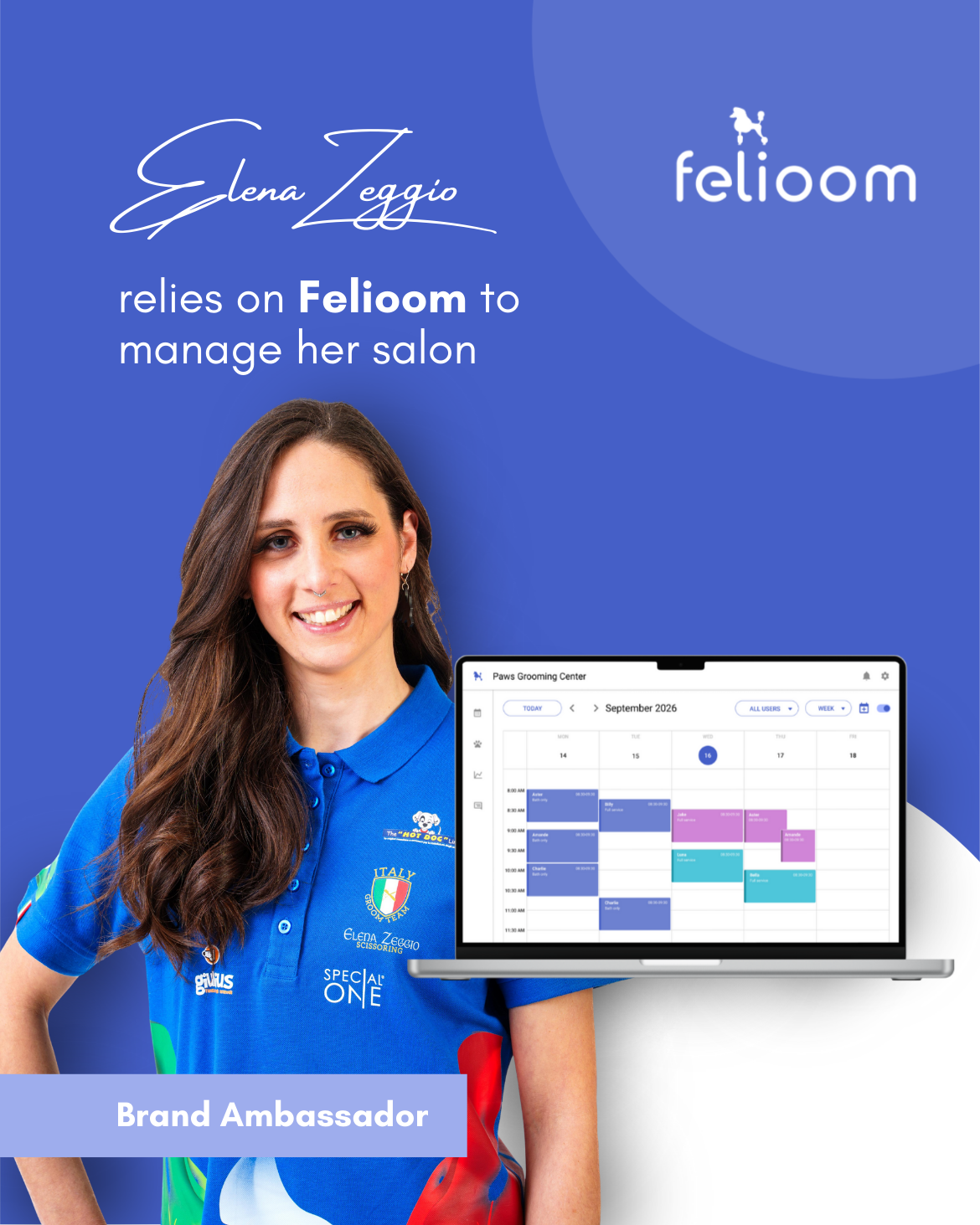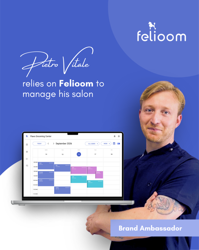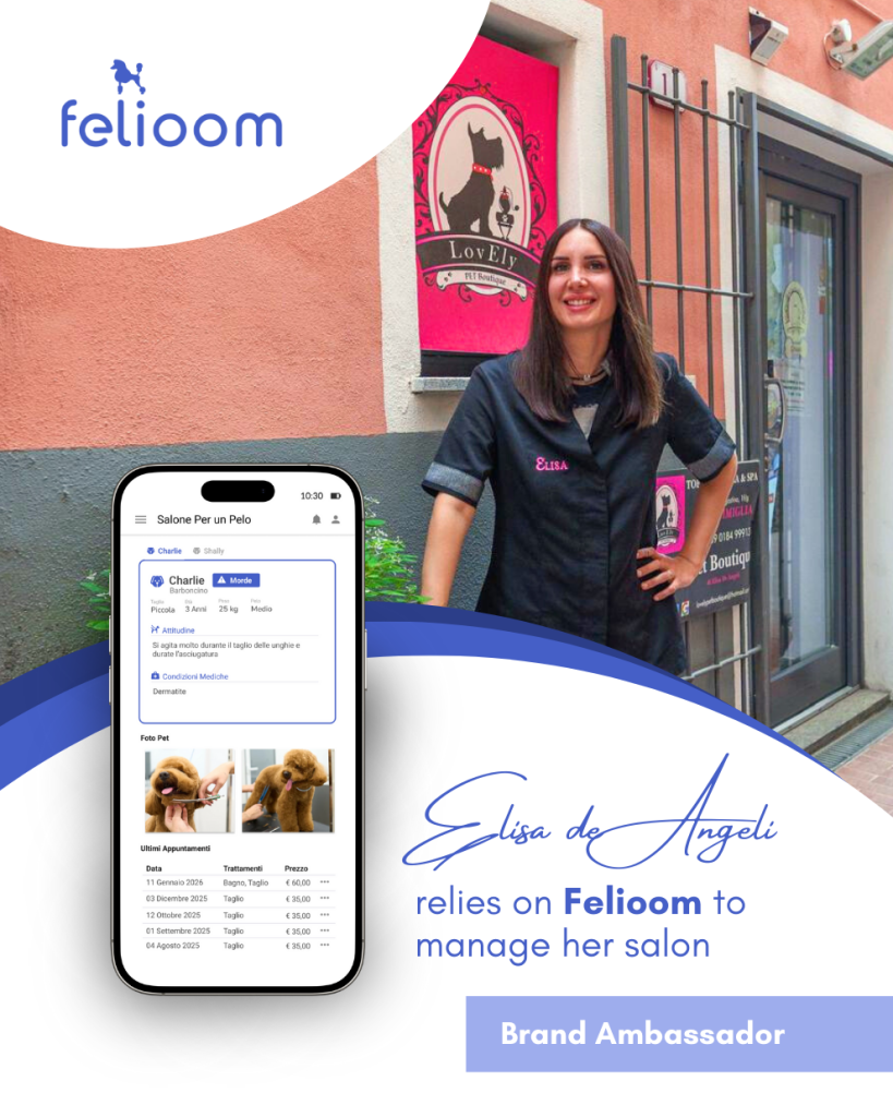 A team of experienced groomers who share our values and proudly represent Felioom: Pietro Vitale, Elisa De Angeli, and Elena Zeggio.